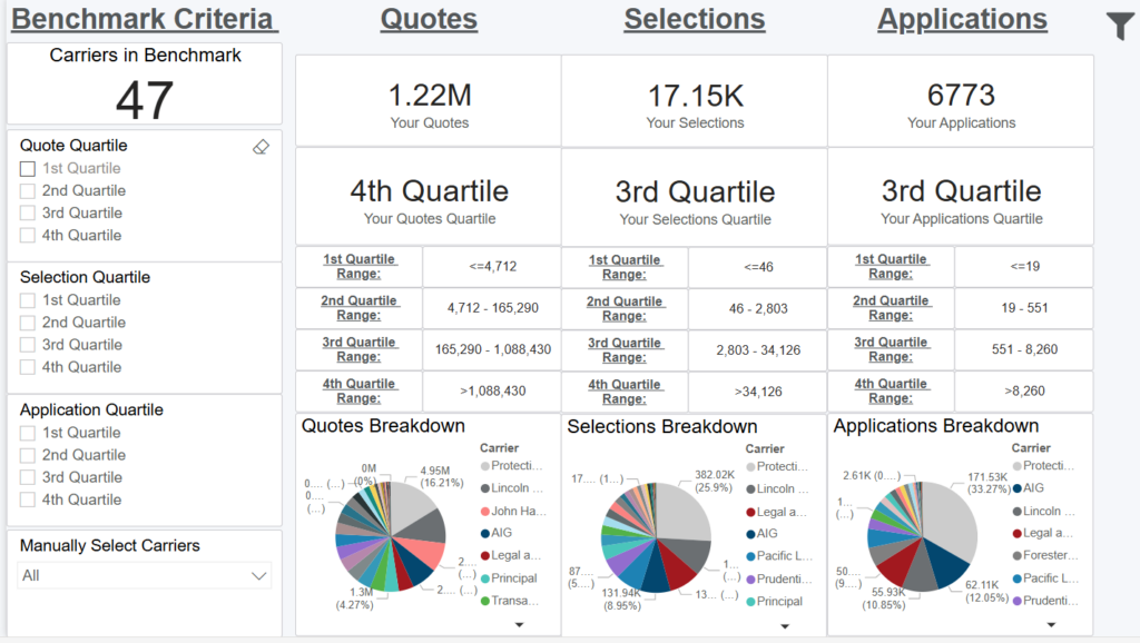 On the right side of the dashboard, you can see your quotes/selections/applications over the last 12 months, the quartile you fall in and the ranges for each quartile. At the bottom, there’s a pie chart with the number of quotes/selections/application for each carrier and the percentage of the total those numbers represent.