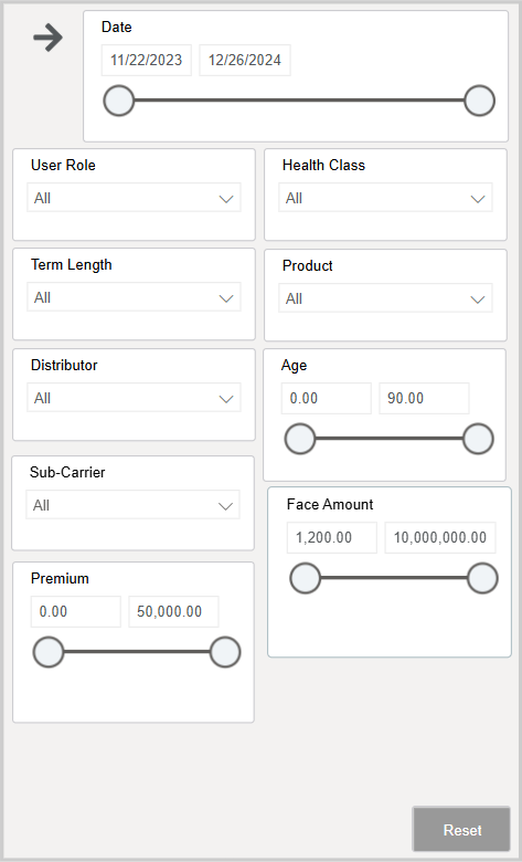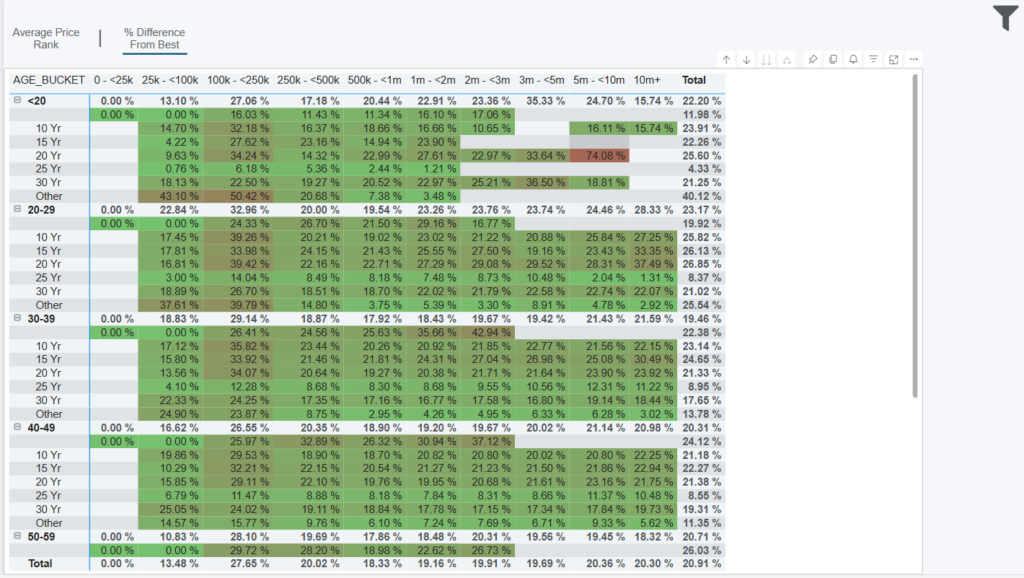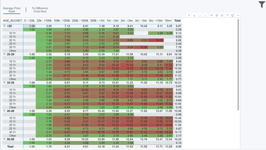 This dashboard displays your average price rank per face amount (top), age bucket (left) and term length (also left underneath the age buckets) for term products. Permanent products are in Other since they don’t have a term length.