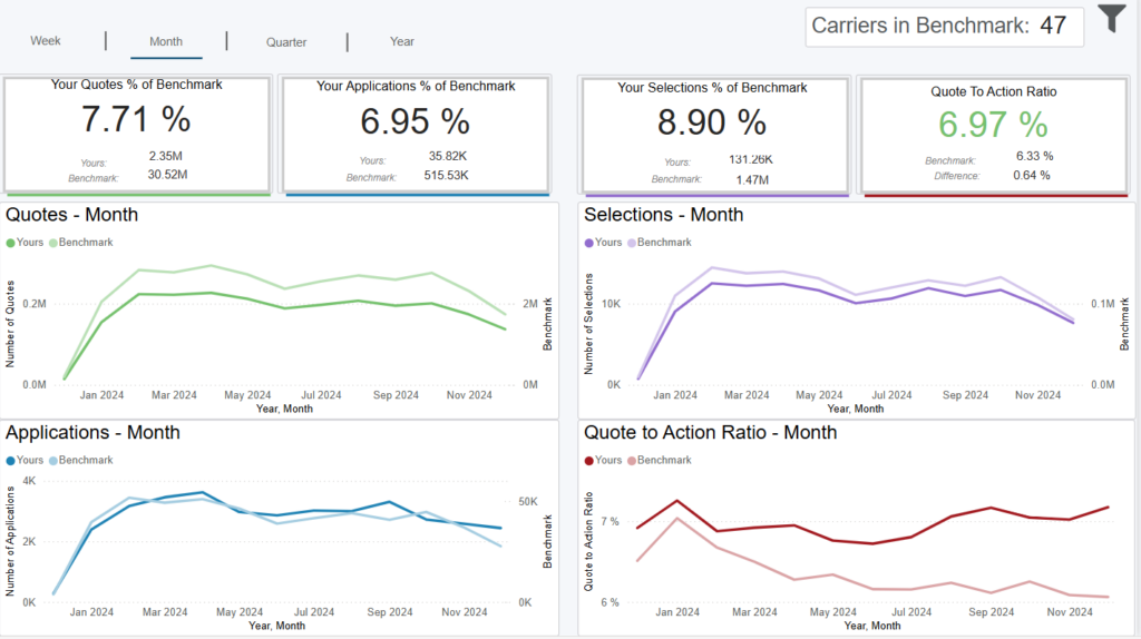 Once set, this benchmark selection will apply to all dashboards. For example, if you choose to compare yourself to carriers in the 4th quartile for quotes, which may be 12 carriers, you will be compared to those 12 other carriers anywhere there is a “benchmark” comparison on the other dashboards. You can change these settings at any time for a different analysis.