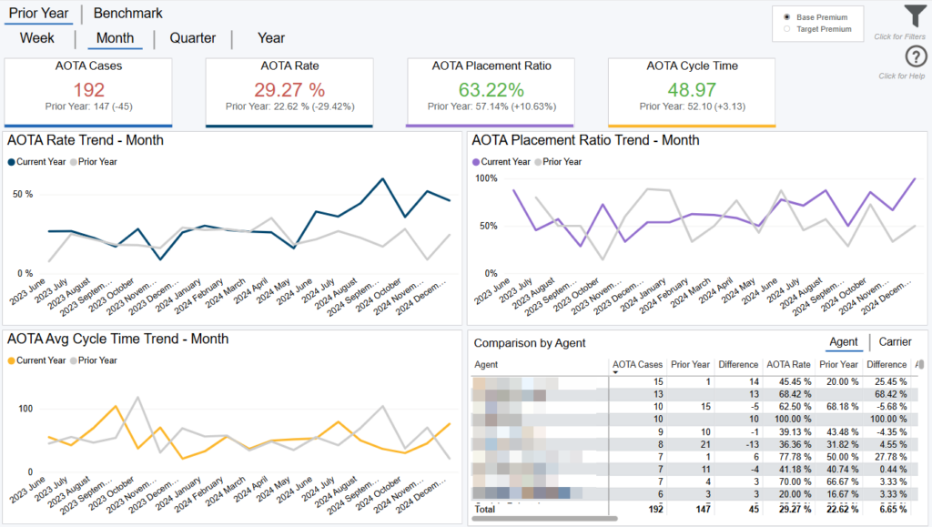 The default view for this dashboard is a “Prior Year” comparison. This compares your lost business rate in total, and across your carriers, products, agents…etc. year over year.