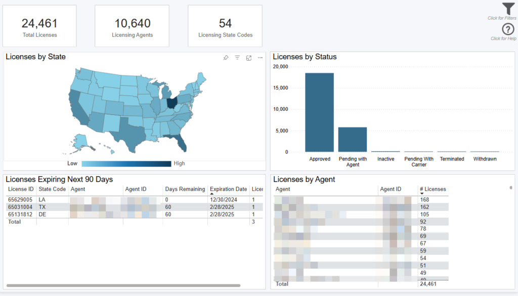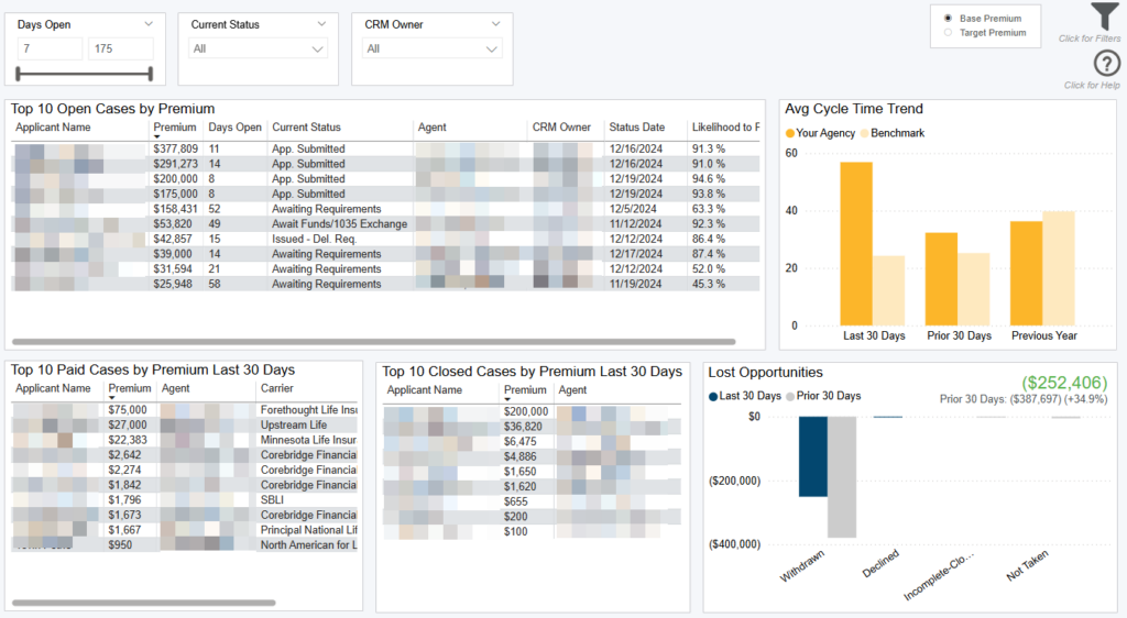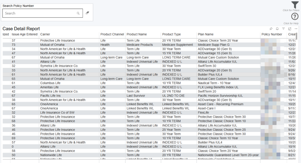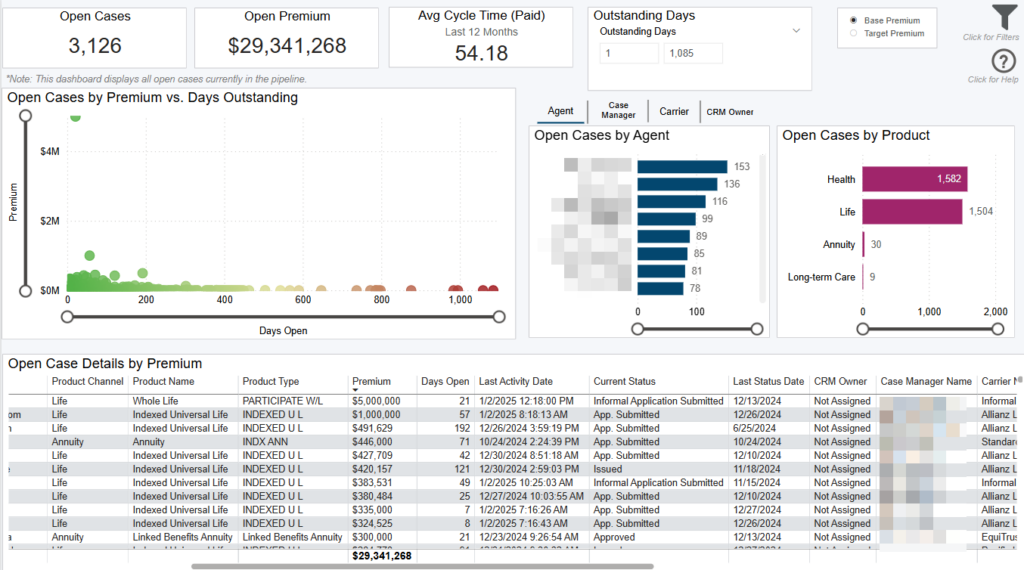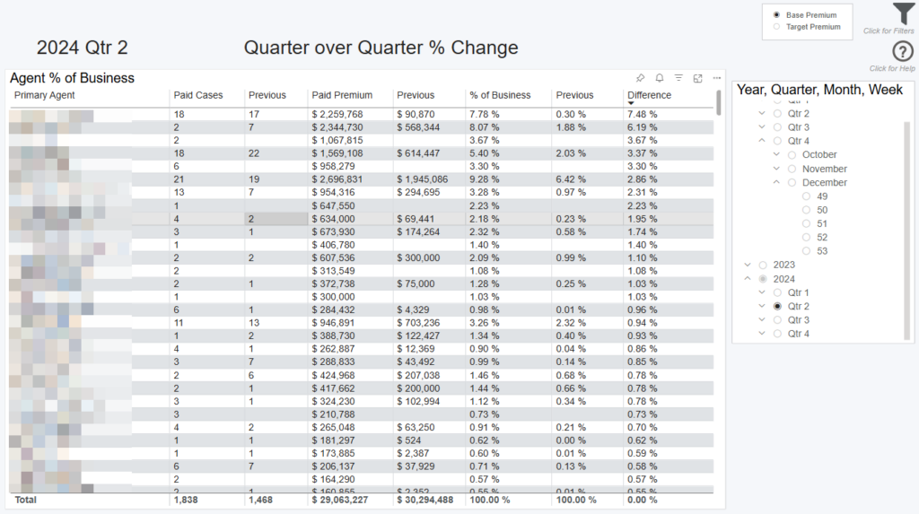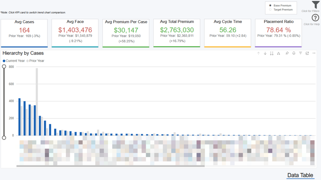Choose the Filter icon in the top right of the dashboard to narrow down by carrier, product, case type, agent, hierarchy, and more. Any selections from this filter pane will dynamically update all visuals on the dashboard.