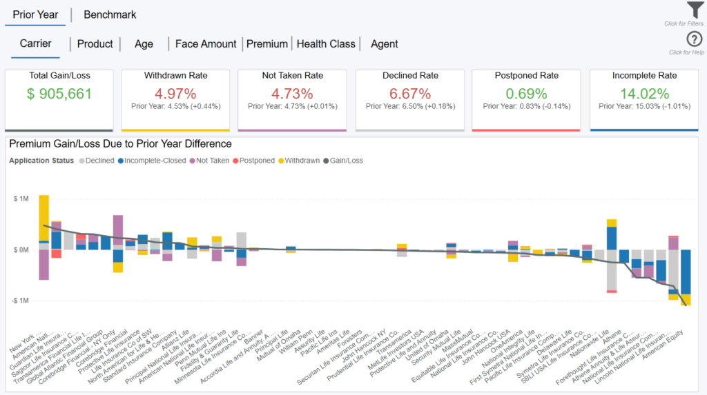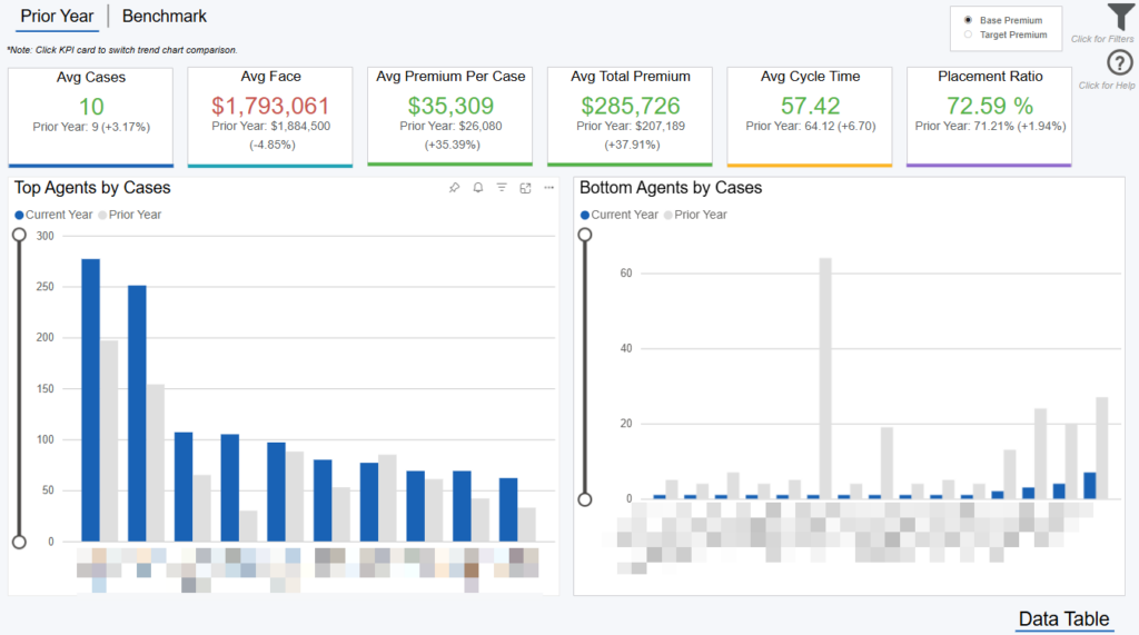On either the “Prior Year” or “Benchmark” view, you can toggle among the “Carrier,” “Product,” “Age,” “Face Amount,” “Premium,” “Health Class,” and “Agent” buttons at the top to get different views of the data.
