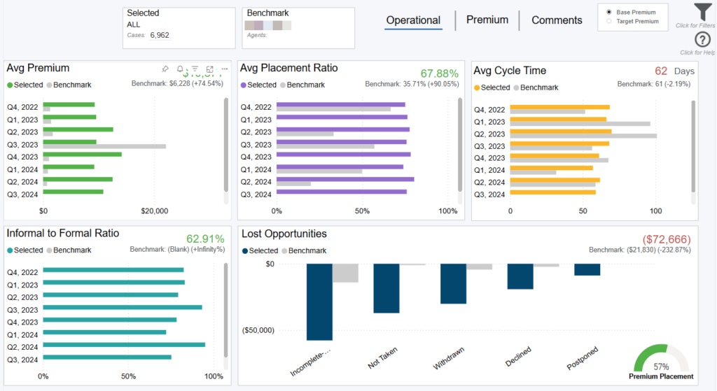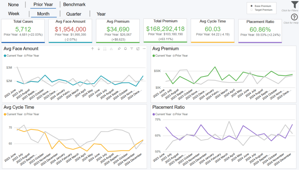 On either the “Prior Year” or “Benchmark” view, you can toggle among the “Carrier,” “Product,” “Age,” “Face Amount,” “Premium,” “Health Class,” and “Agent” buttons at the top to get different views of the data. For easy insights, the “Carrier” and “Agent” views are also visible from their respective scorecards.