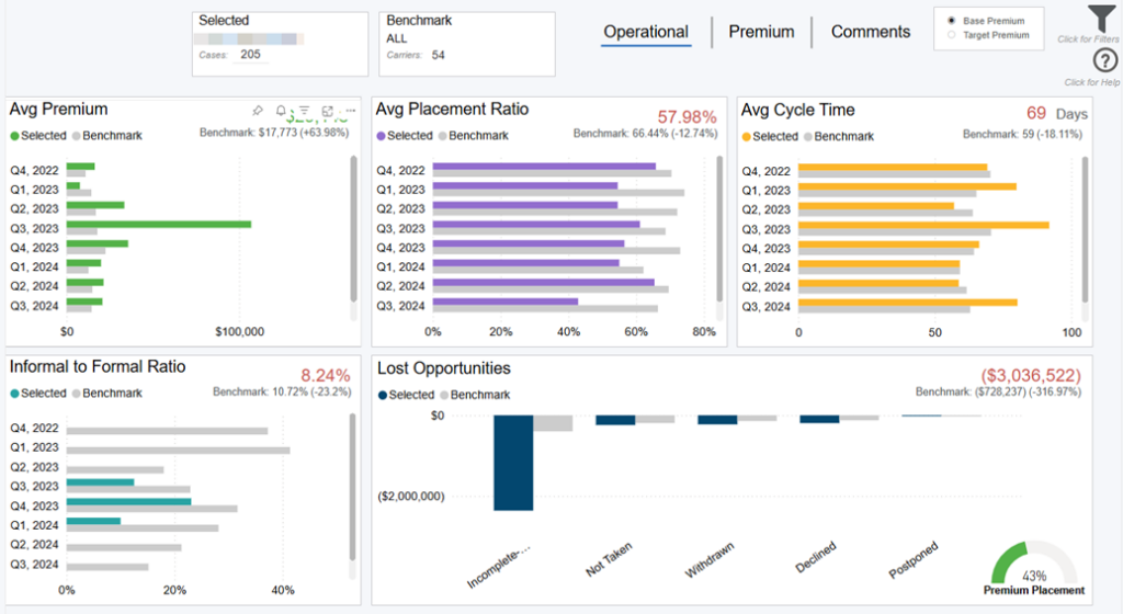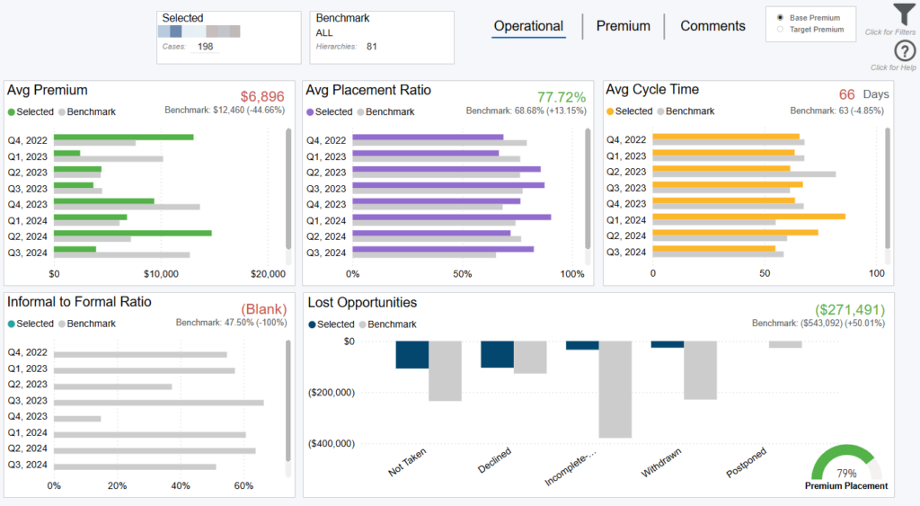 This view displays operational metrics for the selected carrier(s). On this view, you can choose the Filter icon in the top right of the dashboard to select your carrier(s) and carrier(s) for comparison (i.e. the “benchmark”). All calculations in this view are using normalized base premium.