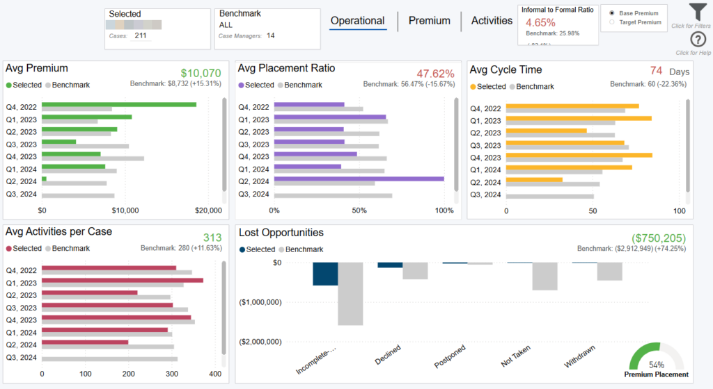 This dashboard displays your performance across various metrics, in total, and over time, including cases, premium, cycle time, and placement ratio.