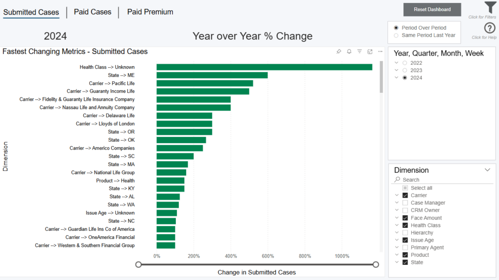 The bar chart displays the percentage change for the time period comparison for either submitted cases, paid cases, or paid premium. You can toggle among these options by clicking the “Submitted Cases,” “Paid Cases,” and “Paid Premium” buttons in the top left of the screen.