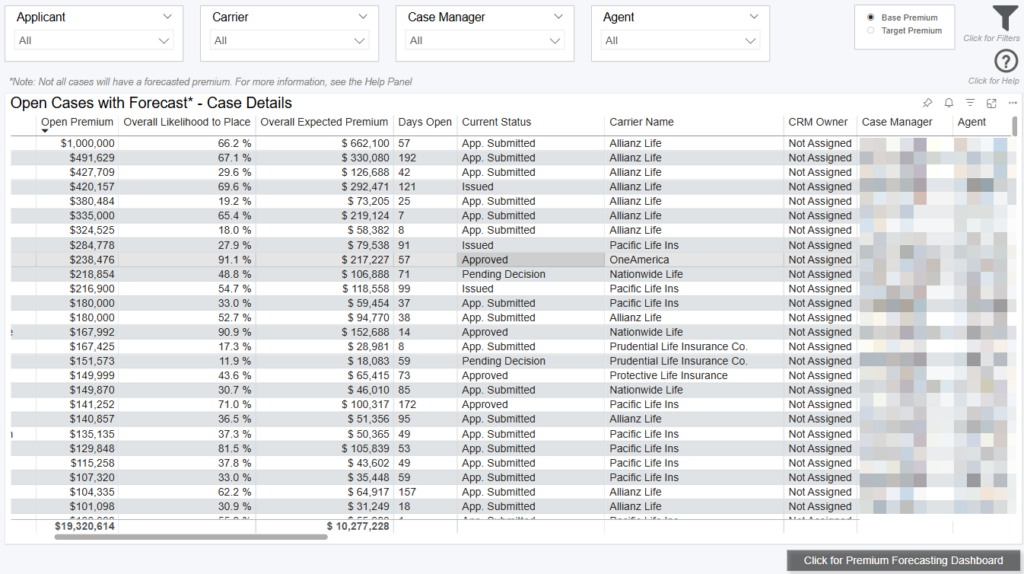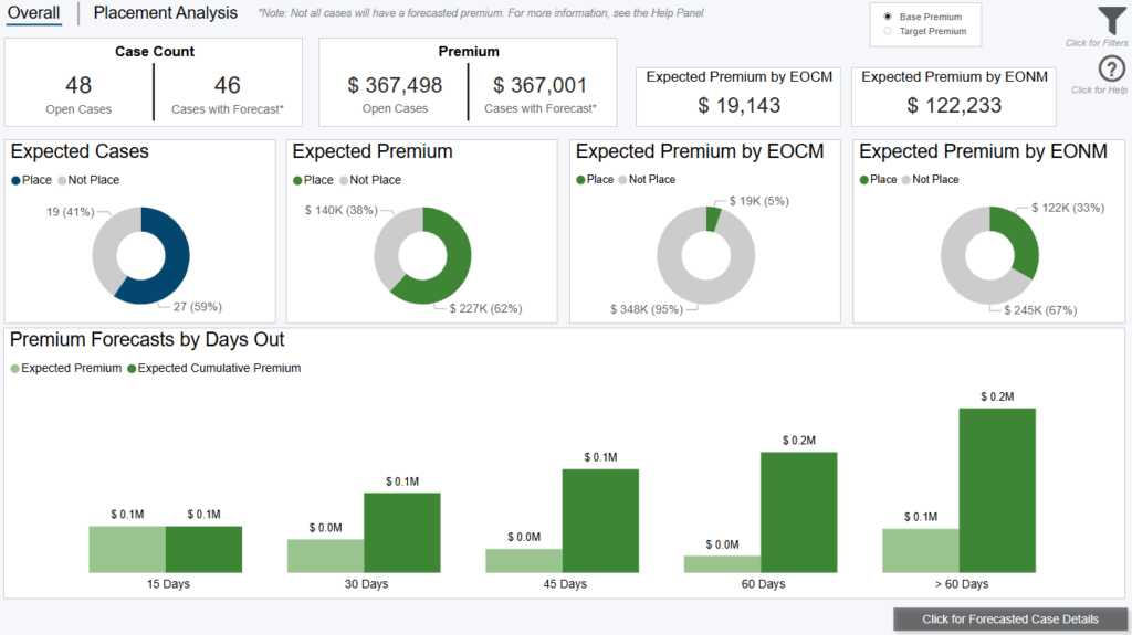 This dashboard displays forecasted premium based on all open formal cases showing their overall Likelihood To Place (LTP) and probability of placing within 15, 30, 45, 60, beyond 60 days, End of Current Month (EOCM), and End of Next Month (EONM). The Forecast can be adjusted with the “Overall Likelihood to Place” slider within the filter pane which allows you to see a more conservative or aggressive outlook on placement.
