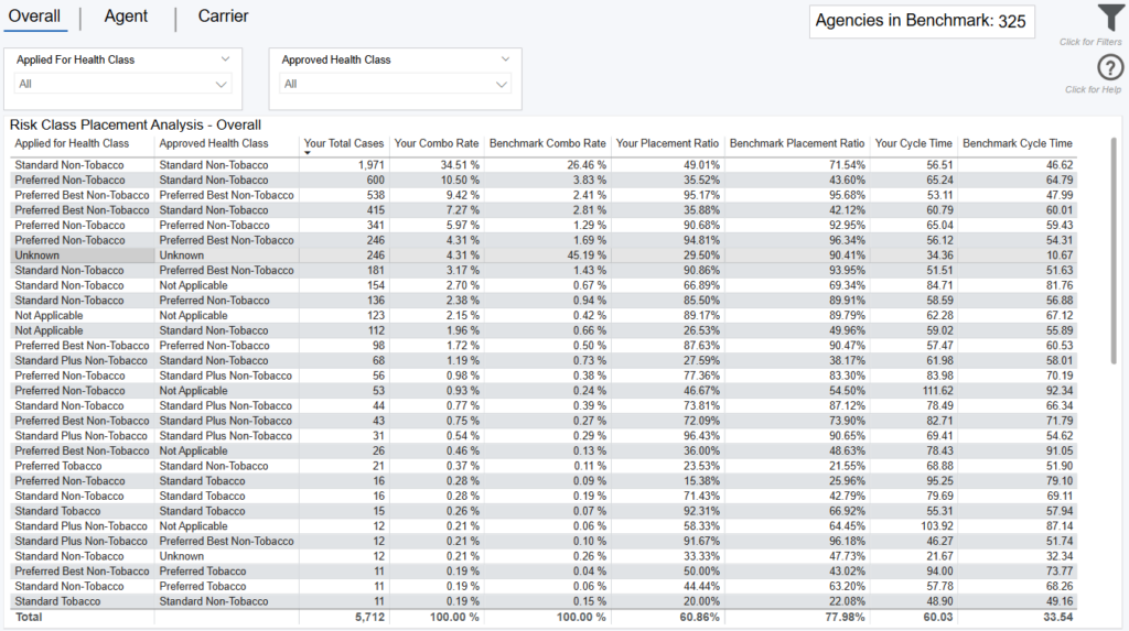 You can change the view by selecting “Overall,” “Agent,” “Carrier” buttons in the top left. Overall shows your total permutations for the applied and approved risk classes, the agent tab compares the same information by agent, and carrier tab compares by carrier.