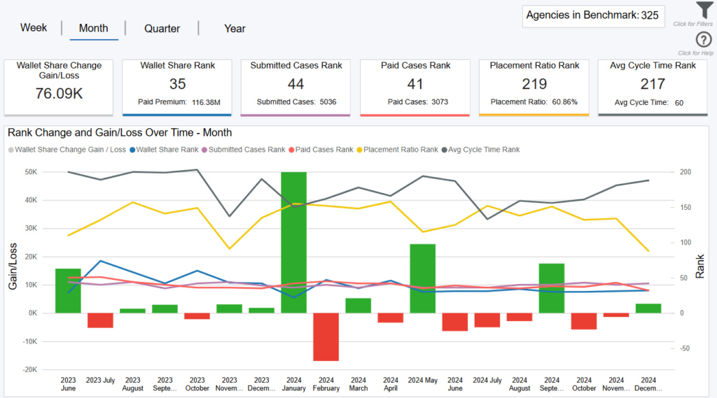 Click the “Benchmark” button at the top left of the dashboard to compare your performance to the other agencies (selected on the Benchmark Criteria dashboard). The total number of agencies in the benchmark is displayed at the top of the dashboard. As you filter, this number will dynamically update.