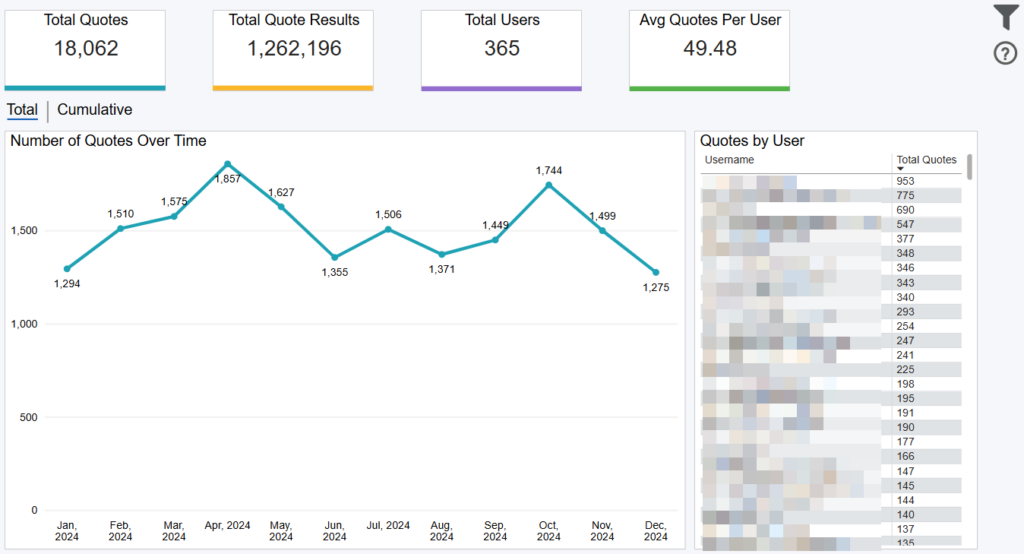This dashboard displays your total number of quotes, quote results, users, average number of quotes per user and a monthly trend of quotes over time. Choose the Filter icon in the top right to refine your results.