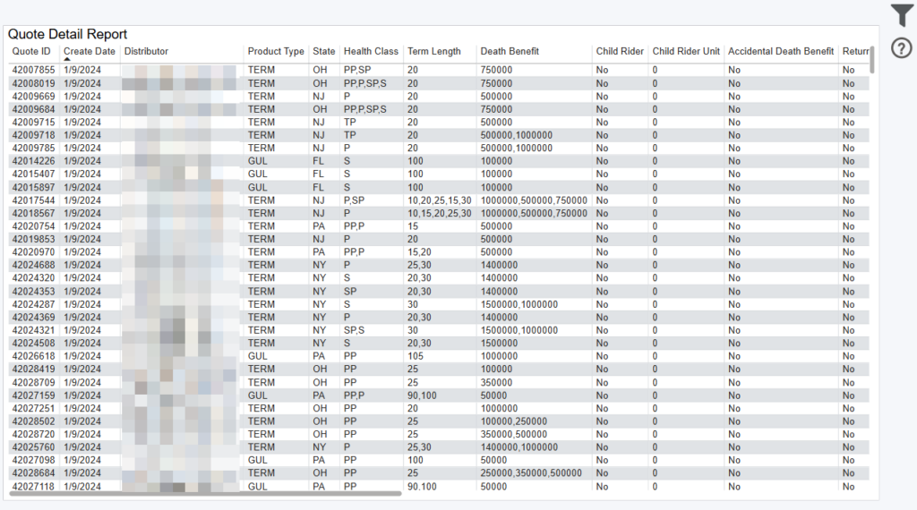 This dashboard displays a detailed report of all quotes for each user, along with some user details.
